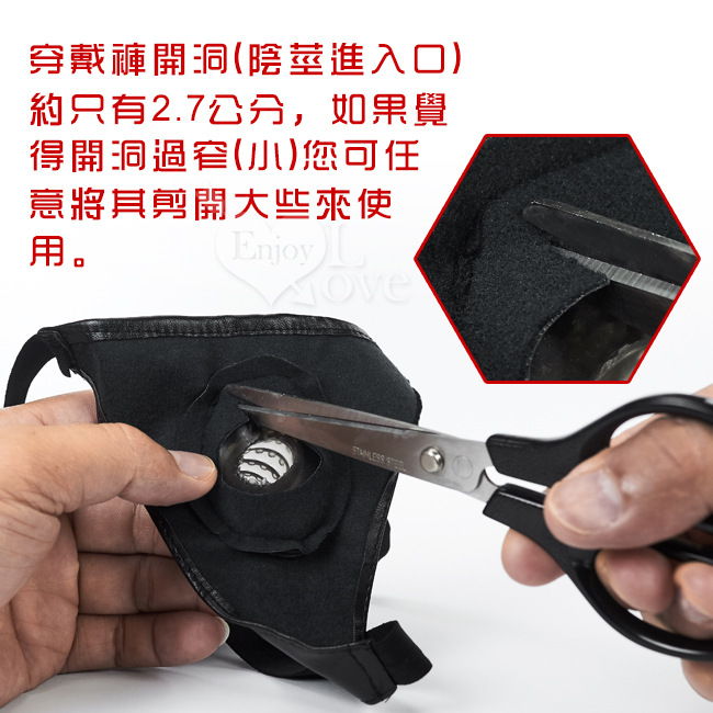 穿戴褲開洞(陰莖進入口)約只有2.7公分,如果覺得開洞過窄(小)您可任意將其剪開大些來使用。