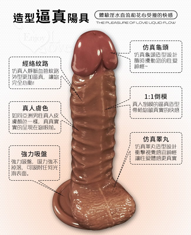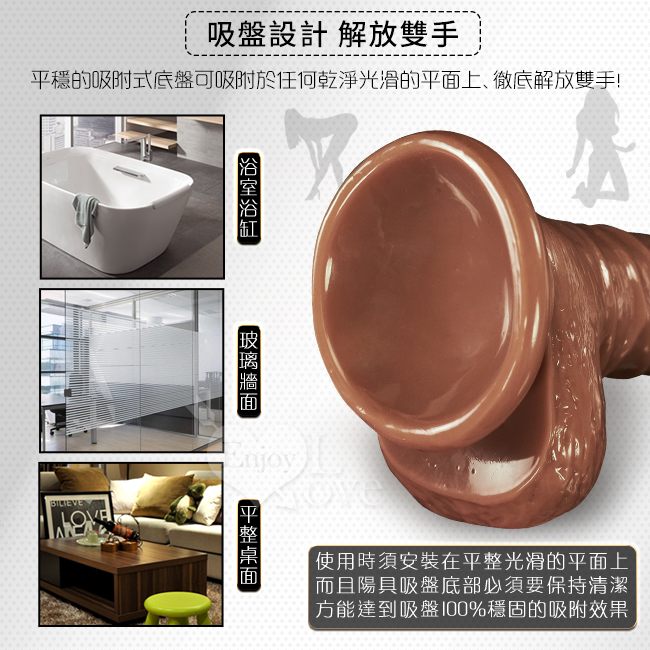 一體成型設計,握感結實,表層細緻Q韌,在底座加上了強力吸盤,可以讓老二棒吸附在任何光滑的表面,不論是玻璃、地板、牆壁等,如此一來您可以使用各種的體位 (坐姿、蹲姿、後背式) 來達到各種不同的高潮體驗。