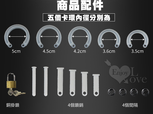 2) 不同尺寸卡環有5個(使用時只需挑選1個合適的)/ 五個卡環的尺寸:5cm, 4.5cm, 4.2cm, 3.6cm, 3.5cm。