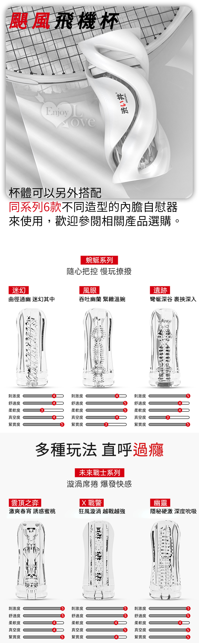 ■ 颶風飛機杯體可以另外搭配同系列6款不同造型的內膽自慰器來使用,歡迎參閱相關產品選購。