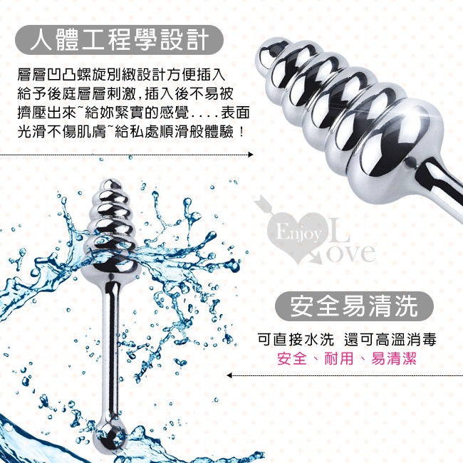 層層凹凸螺旋別緻的設計,全長15.5m,最大直徑3.5cm,男女通用器具,光滑的表面進入時令人渾然忘我。由小至大的撫慰設計,讓你享受異種的美妙刺激,適合前後庭按摩刺激,誘發性興奮。