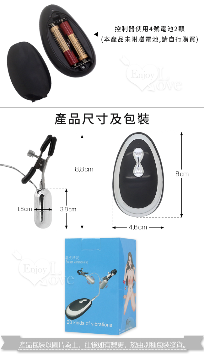 全新精密高感度20段式開關,乳夾壓力鬆緊鈕乳夾壓力可自由調整,安全矽膠套,保護肌膚不會夾傷,讓您享受歡樂高潮又無後顧之憂。