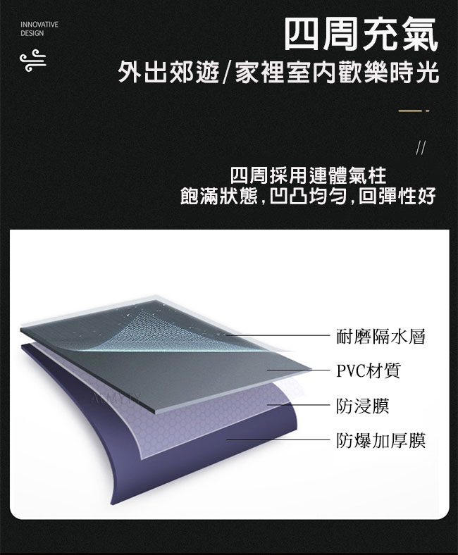 野營郊遊:野營鋪在需要使用的地方可以隔水隔潮,郊遊鋪在草坪上可以隔水隔潮,充氣圍-充氣後可以在一定程度上防止爬蟲進入做在裡面休息更愜意。