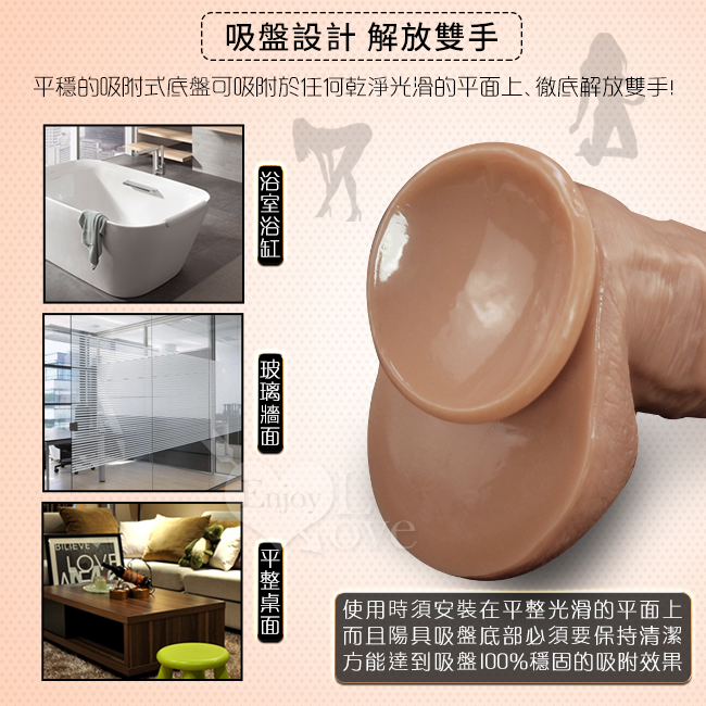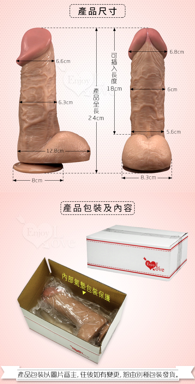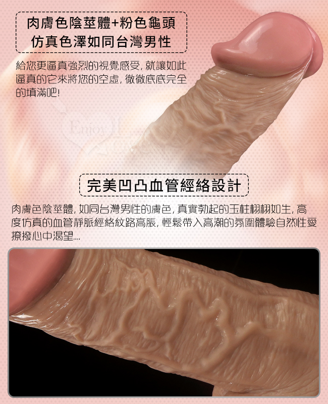 最新推出的Enjoy Love‧擬真系列逼真按摩棒,材質採用高級矽膠,軟硬度適中,不會過硬而讓使用者使用時感到不適,也不會太軟,是經過市場問卷調查後採用最多數女性可以接受的軟硬度而設計,而外型方面則是根據美國男性朋友的各種陰莖造型倒模製作,就連陰莖上的皺摺與爆筋都完整的重現,各種造型的龜頭也都任君選擇,大小從5吋~11吋都有,不論是喜歡短小精幹或是喜愛大老二的女性都可以滿足需求。