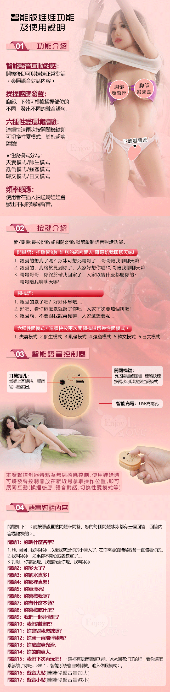 使用部位:陰交、肛交、口交、乳交四種性交用法,內置合金骨骼可固定姿勢,關節可動,可隨意變更姿勢