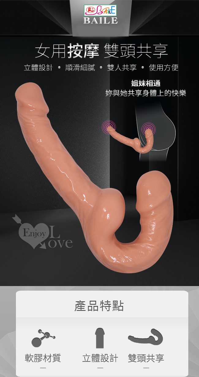 本商品可做為女同志專用雙爽型按摩棒,搭配穿戴褲時(請另購),較短的一頭G點按摩棒可插入穿戴者的後庭或陰道,不只是能帶給對方快感,穿戴者本身也能同時享受極度快感,如此特別的產品是女同志朋友們的最愛。