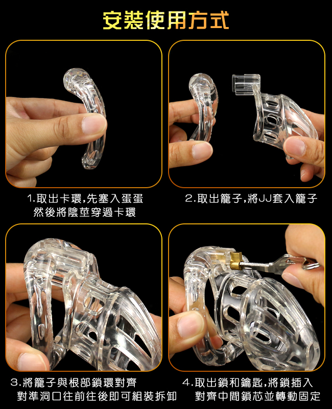 備註:1.內附不同尺寸卡環4個,使用時只需選1個合適的。2.配置新款CB貞操籠隱形JJ鎖