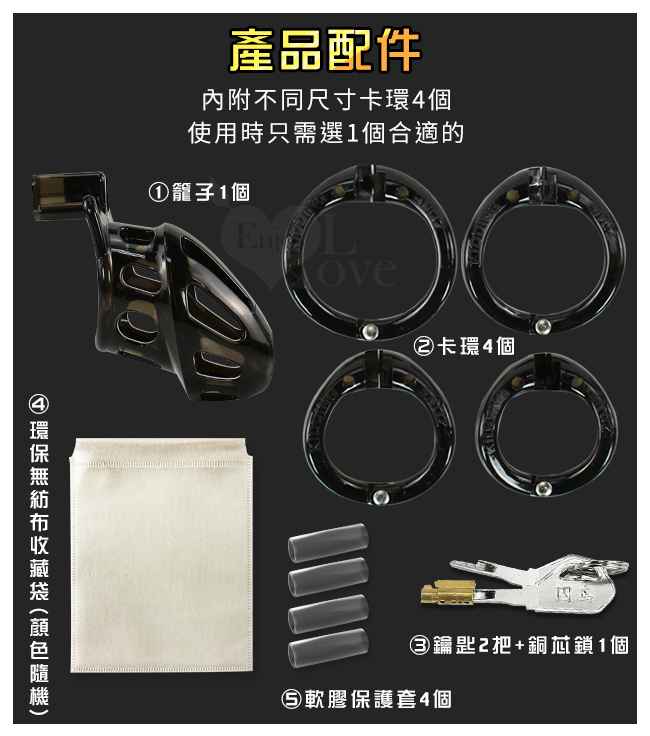 備註:1.內附不同尺寸卡環4個,使用時只需選1個合適的。2.配置新款CB貞操籠隱形JJ鎖