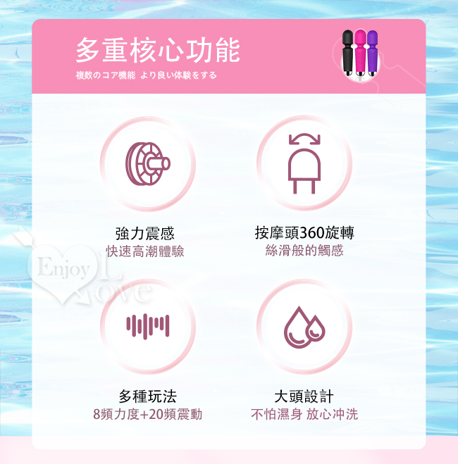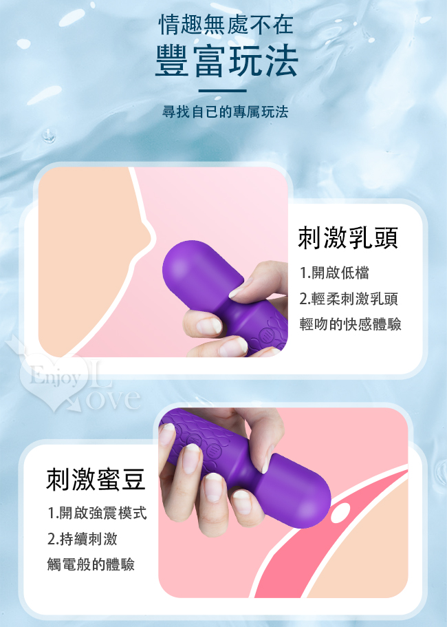 ■ 特色:20段變頻震動+8種強度調控、低噪靜音設計、生活防水
