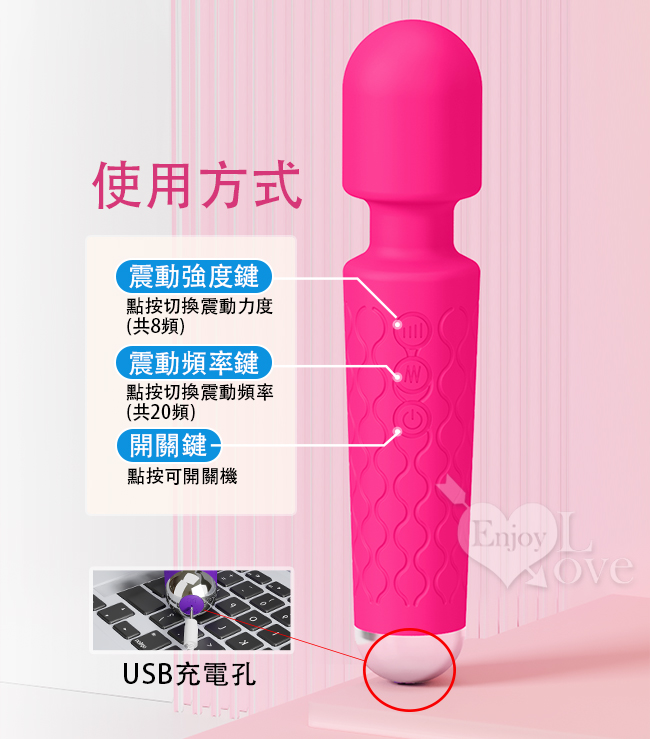 擁有20段變頻帶來20種銷魂刺8種震動強度讓快感層層疊進直到潮噴,讓您體驗多重節奏帶來的快感刺激!