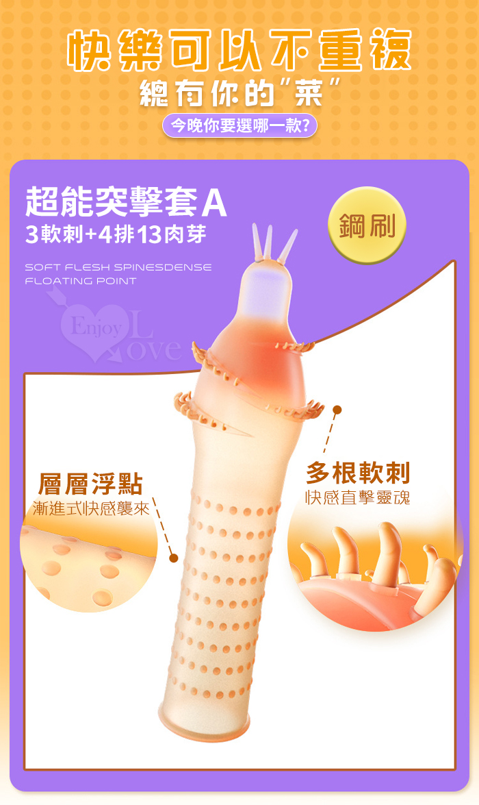當前位置: 首頁 > 男性用品 > 猛男加強裝備 > Enjoy Love ‧ 超能突擊套A 3軟刺+4排13肉芽 輕薄裸入感浮點陰莖套﹝鋼刷﹞