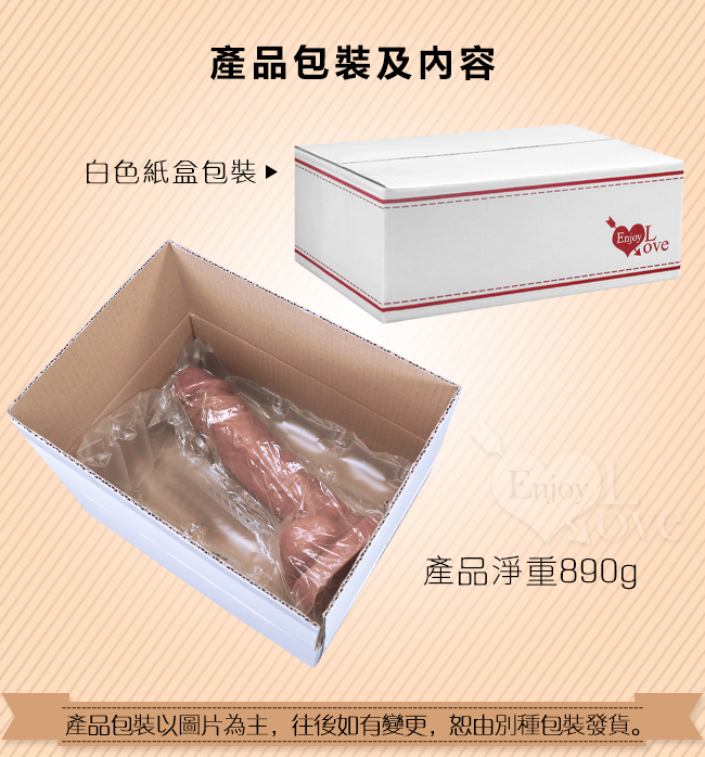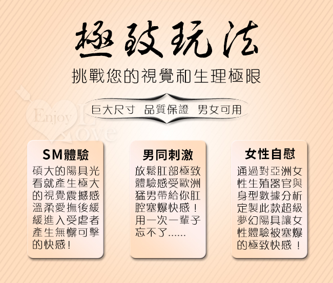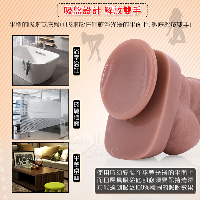 最新推出的Enjoy Love‧擬真系列逼真按摩棒,材質採用高級矽膠,軟硬度適中,不會過硬而讓使用者使用時感到不適,也不會太軟,是經過市場問卷調查後採用最多數女性可以接受的軟硬度而設計,而外型方面則是根據美國男性朋友的各種陰莖造型倒模製作,就連陰莖上的皺摺與爆筋都完整的重現,各種造型的龜頭也都任君選擇,大小從5吋~11吋都有,不論是喜歡短小精幹或是喜愛大老二的女性都可以滿足需求。