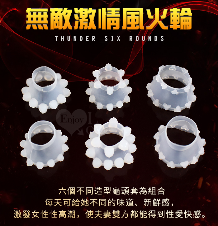 以六個不同造型龜頭套為組合。陰莖套採用全新韌性出色的SPVC新材料。舒適的柔軟感覺可以長時間配帶使用,同時能和安全套以及其他性用品同時使用。