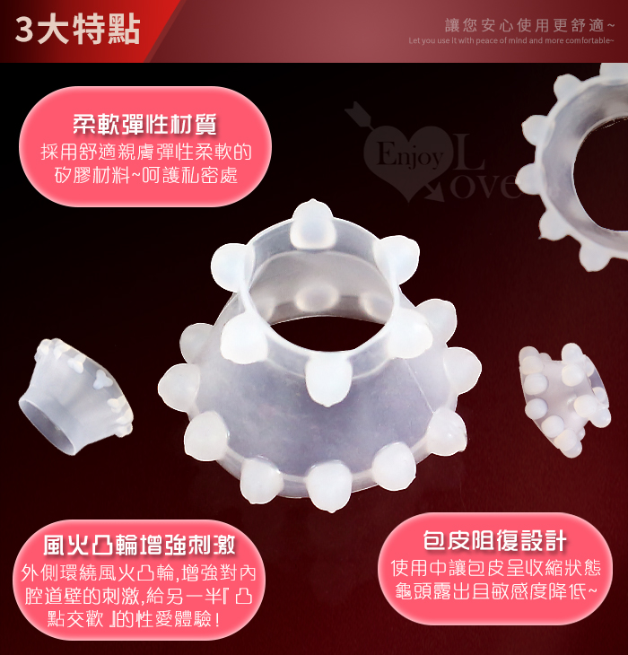 同時,環上的風火凸輪可刺激女性敏感部位,隨著抽動不斷對女性的陰道進行碰撞刺激,增加性快感,激發女性性高潮,使夫妻雙方都能得到性愛快感。