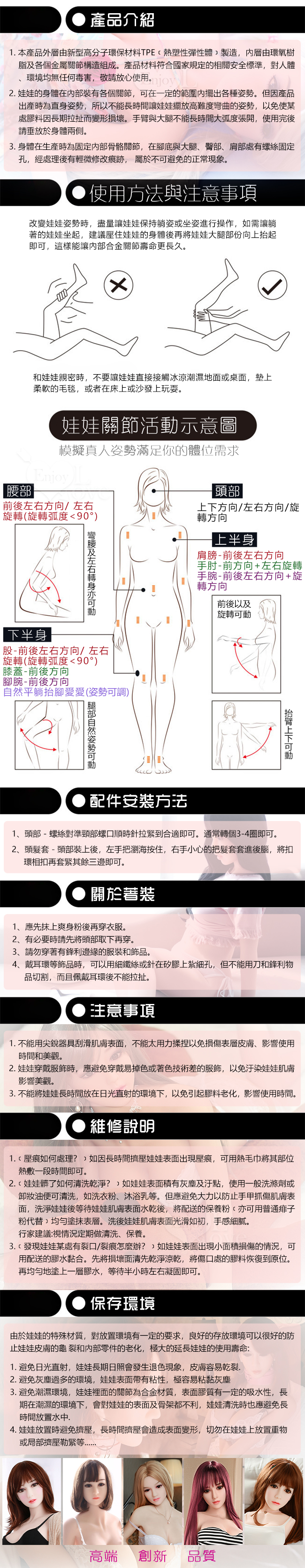 使用部位:陰交、肛交、口交、乳交四種性交用法,內置合金骨骼可固定姿勢,關節可動,可隨意變更姿勢
