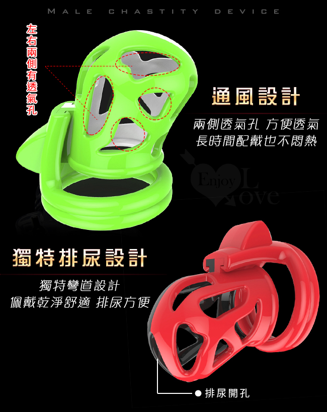 La Color設計團隊zui新創意,雙環造型完美的符合人體結構學特點。 geng貼合人體且不易逃脫,造型新穎的透氣孔設計大大減少了市面上其他貞操鎖長時間佩戴後所產生的潮濕悶熱感,給你的小鳥提供一個舒適的鳥巢。